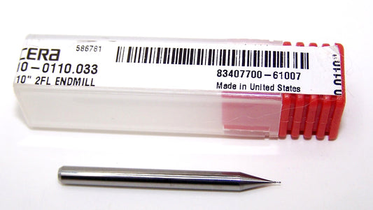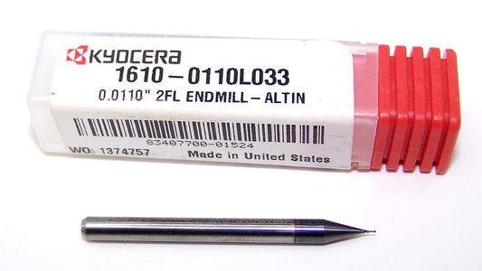 1610-0110.033 Kyocera .0110" Carbide 2 Flute End Mill .0110" Diameter .033" Flute Length 1.50" Length .125" Shank