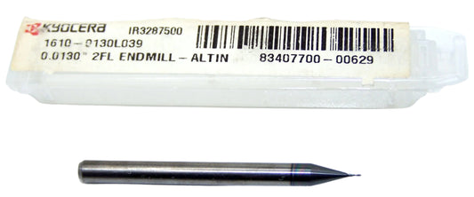 1610-0130L039 Kyocera 0.0130" Carbide 2 Flute End Mill ALTiN Coated 0.0130" Diameter 0.0390" Flute 1.5" Length 0.125" Shank
