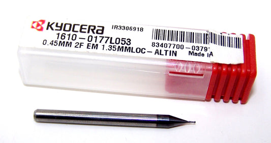 1610-0177L053 Kyocera 0.45mm Carbide 2 Flute End Mill ALTiN Coated 0.0177" Diameter 0.0530" Flute 1.5" Length 0.1181" Shank
