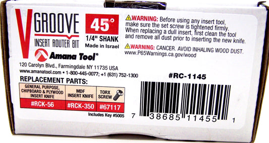 RC-1145 Amana Tool 45° V Groove Insert Router Bit .812" Diameter .984 Depth 2.312" Length .250" Shank