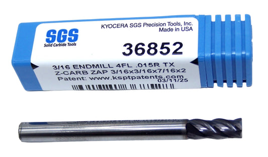 36852 Kyocera SGS 3/16" Carbide 4 Flute End Mill .015" Radius TX Coated .1875" Diameter .4375" Flute 2.00" Length .1875" Shank Z-Carb AP