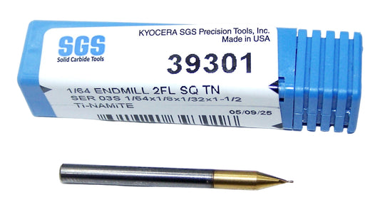 39301 Kyocera SGS 1/64" Carbide End Mill 2 Flute SQ TiN Coated .0156" DIA .031" Flute 1.50 Length .125" Shank