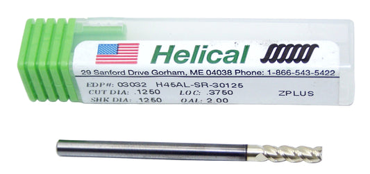 03032 Helical Solutions 1/8" Carbide 3 Flute End Mill 45° Helix for Aluminum Square ZrN Coat .125" Diameter .375" Flute 2.0" Length .125" Shank H45AL-SR-30125