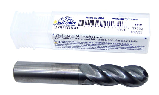 27950010B MAFORD 1/2" Carbide 4 Flute End Mill BALL .5000" Diameter 1.25" Flute 3.00" Length .500" Shank (27932)