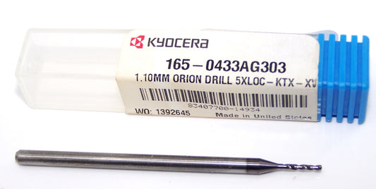 165-0433AG303 Kyocera 1.10mm Carbide 2 Flute Drill High Performance .0433" Diameter .303" Flute 1.97" Length .118" Shank 142° Point Coated