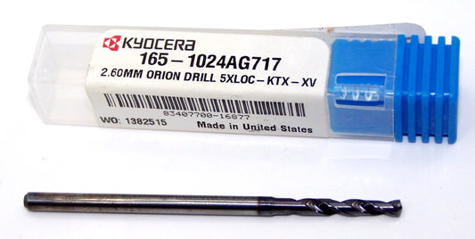 165-1024AG717 Kyocera 2.60mm Carbide 2 Flute Drill High Performance .1024" Diameter .717" Flute 2.62" Length .118" Shank 142° Point Coated