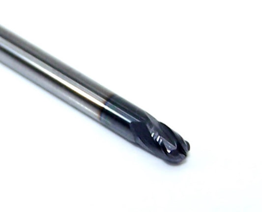 1845-0938.590 Kyocera 3/32" Carbide 4 Flute End Mill Ball End Extended Reach .590" Reach 0.0938" Diameter 0.281" Flute 2.0" Length 0.125" Shank