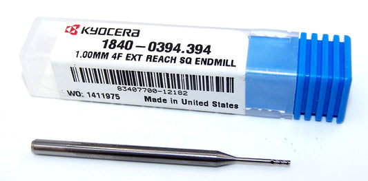 1840-0394.394 Kyocera 1.00mm Carbide 4 Flute End Mill Extended Reach .0394" Diameter .1181" Flute 1.97" Length .118" Shank