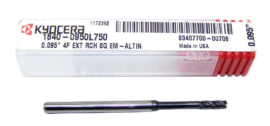 1840-0950L750 Kyocera 0.0950" Carbide 4 Flute End Mill Extended Reach ALTiN Coated 0.0950" Diameter 0.750" Flute 2" Length 0.125" Shank