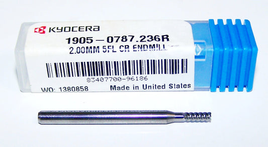 1905-0787L236R Kyocera 2.00mm Carbide 5 Flute End Mill for hard metals AlTiN Coated .0079" Radius .0787" Diameter .236" Flute 1.50" Length .1181" Shank