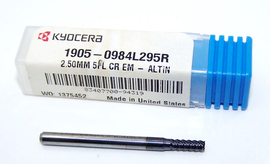 1905-0984L295R Kyocera 2.50mm Carbide 5 Flute End Mill for hard metals AlTiN Coated .0098" Radius .0984" Diameter .295" Flute 1.50" Length .1181" Shank