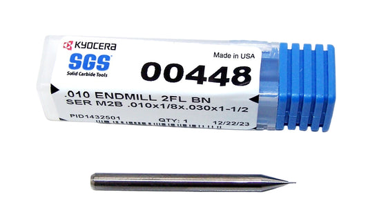 00448 Kyocera SGS .0100" Carbide 2 Flute Ball End Mill .0100" Diameter .030" Flute 1.5" Length .125" Shank