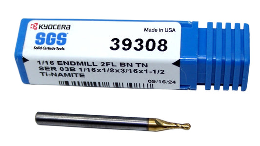 39308 Kyocera SGS 1/16" Carbide 2 Flute End Mill Ball End TiN .0625" Diameter .187" Flute 1.50" Length .125" Shank