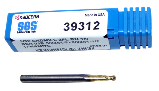 39312 Kyocera SGS 3/32" Carbide 2 Flute End Mill Ball End TiN .0938" Diameter .281" Flute 1.50" Length .125" Shank