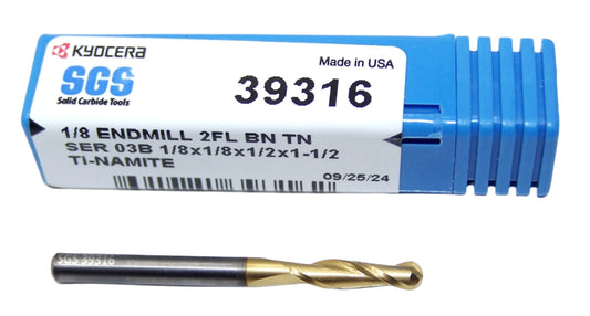 39316 Kyocera SGS 1/8" Carbide 2 Flute End Mill Ball End TiN .125" Diameter .500" Flute 1.50" Length .125" Shank