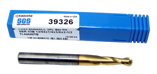 39326 Kyocera SGS 13/64" Carbide 2 Flute End Mill Ball End TiN .2031" Diameter .625" Flute 2.50" Length .250" Shank