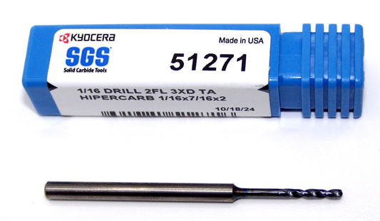 51271 SGS Carbide 1/16" Carbide Drill 2 Flute External Coolant AlTiN .0625" Diameter 0.4375" Flute 2.00" Length .125" Shank 145° Point
