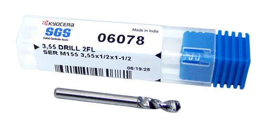 06078 Kyocera SGS 3.55mm Carbide Drill 2 FLUTE .1398" Diameter .500" Flute 1.50" Length .125" Shank 130° Point
