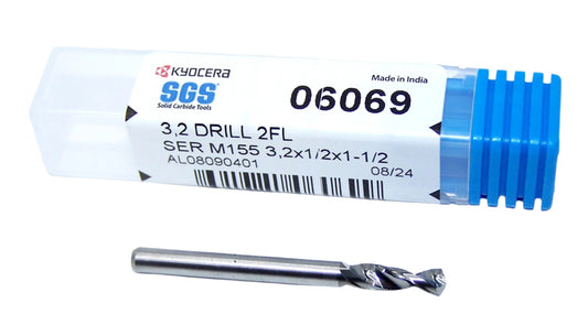 06069 Kyocera SGS 3.20mm Carbide Drill 2 FLUTE .1260" Diameter .500" Flute 1.50" Length .125" Shank 130° Point