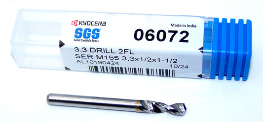 06072 Kyocera SGS 3.30mm Carbide Drill 2 FLUTE .1299" Diameter .500" Flute 1.50" Length .125" Shank 130° Point