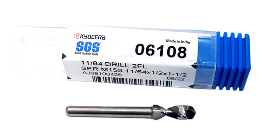 06108 Kyocera SGS 11/64" Carbide Drill 2 FLUTE .1719" Diameter .500" Flute 1.50" Length .125" Shank 130° Point