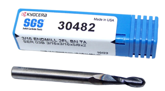 30482 Kyocera SGS 3/16" Carbide 2 Flute End Mill Ball End AlTiN Coated .1875" Diameter .625" Flute 2.00" Length .1875" Shank