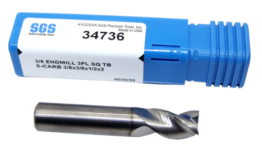 34736 Kyocera SGS 3/8" Carbide 3 Flute End Mill TiB2 Coated S-Carb Square 0.3750 Diameter .500 Flute 2.00 Length .375 Shank