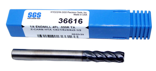 36616 Kyocera SGS 1/4" Carbide 4 Flute End Mill .020" Radius .250" Diameter 0.750" Flute 2.50" Length .250" Shank Z-Carb HTA