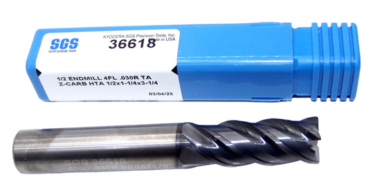 36618 Kyocera SGS 1/2" Carbide 4 Flute End Mill .030" Radius .500" Diameter 1.25" Flute 3.25" Length .500" Shank Z-Carb HTA