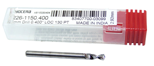 226-1150.400 Kyocera 2.92mm Carbide 2 Flute Drill PCB Type 0.1150" Diameter 0.400" Flute 1.5" Length 0.1181" Shank 130° Point