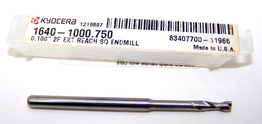 1640-1000.750 Kyocera .1000" Carbide 2 Flute End Mill Extended Reach SQ .1000" Diameter .300" Flute 2.00" Length .125" Shank .750" Reach