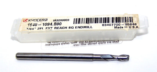 1640-1094.590 Kyocera 7/64" Carbide 2 Flute End Mill Extended Reach SQ .1094" Diameter .328" Flute 2.00" Length .125" Shank .590" Reach