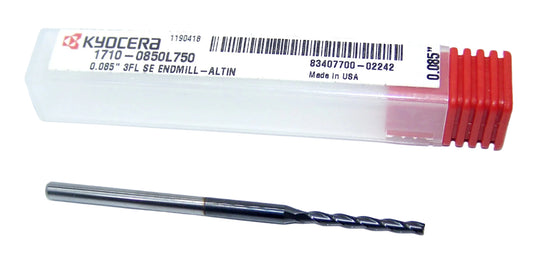 1710-0850L750 Kyocera 0.0850" Carbide 3 Flute End Mill ALTiN Coated 0.0850" Diameter 0.750" Flute 2.5" Length 0.125" Shank