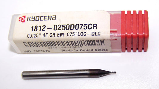 1812-0250D075CR Kyocera #72 Carbide 4 Flute End Mill .005" Corner Radius DLC Coated .0250" Diameter .075" Flute 1.50" Length .125" Shank