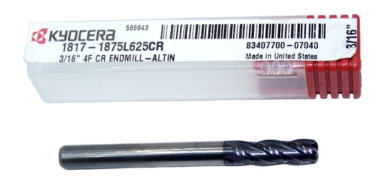 1816-1875L625CR Kyocera 3/16" Carbide 4 Flute End Mill 0.030" Radius ALTiN Coated 0.1875" Diameter 0.625" Flute 2.00" Length 0.1875" Shank