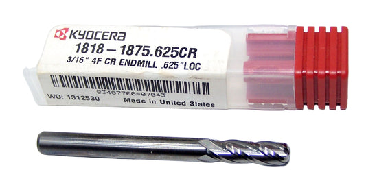 1818-1875.625CR Kyocera 3/16" Carbide 4 Flute End Mill 0.060" Radius 0.1875" Diameter 0.625" Flute 2.00" Length 0.1875" Shank