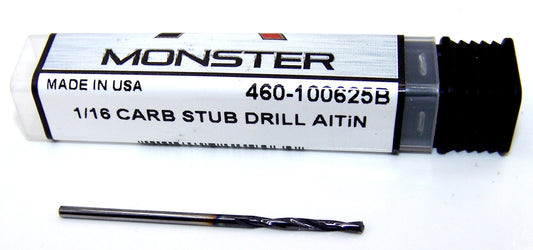 460-100625B Monster Tool 1/16" Carbide Drill 2 Flute AlTiN .0625" Diameter .625"Flute 1.625" Length .0625" Shank