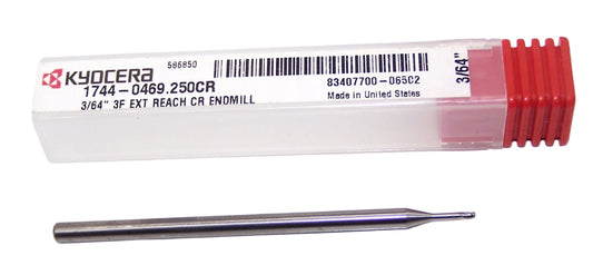 1744-0469.250CR Kyocera 3/64" Carbide 3 Flute End Mill .250" Extended Reach .010" Radius .0469" Diameter .070" Flute 2.50" Length .125" Shank