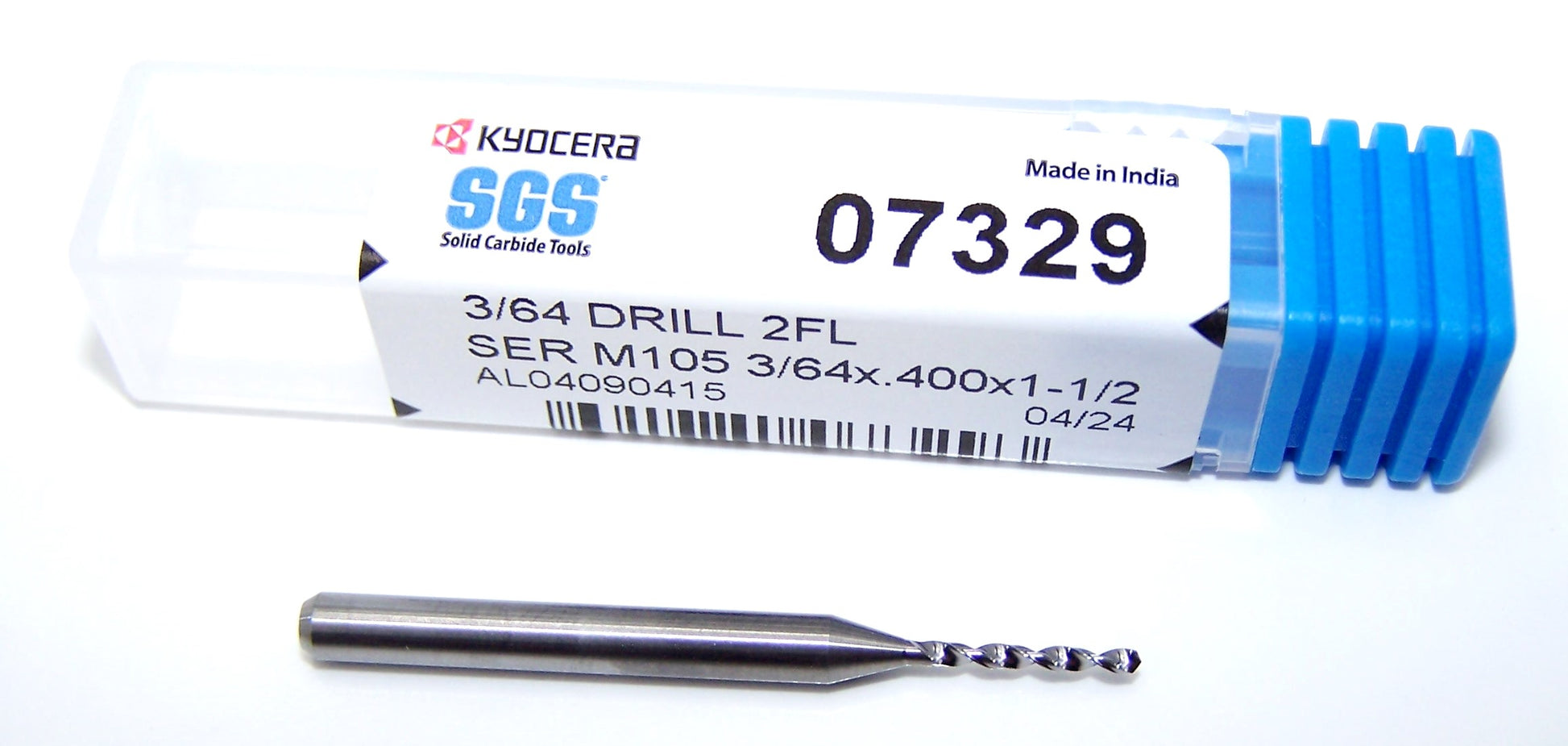 07329 Kyocera SGS 3/64" Carbide Drill 2 FLUTE 0.0469" Diameter .400" Flute 1.50" Length .125" Shank 130° Point