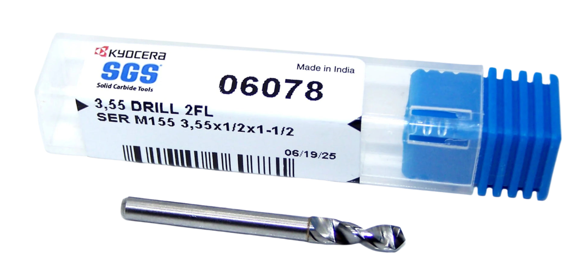 06078 Kyocera SGS 3.55mm Carbide Drill 2 FLUTE .1398" Diameter .500" Flute 1.50" Length .125" Shank 130° Point