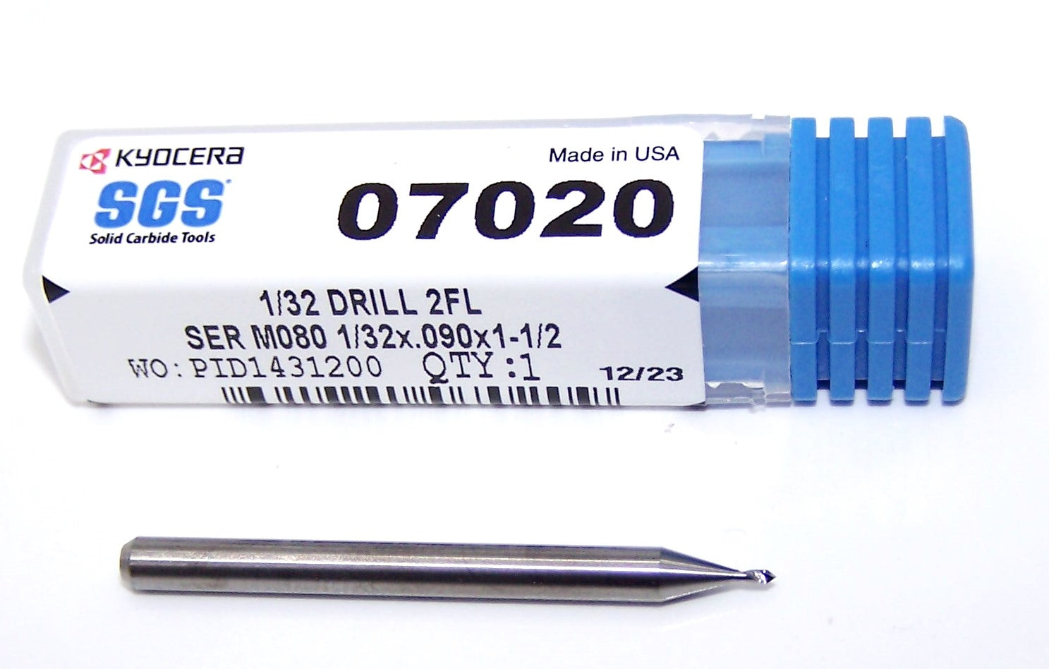 07020 Kyocera SGS 1/32" Carbide Spot Drill 2 FLUTE 0.0312" Diameter .090" Flute 1.50" Length .125" Shank 90° Point