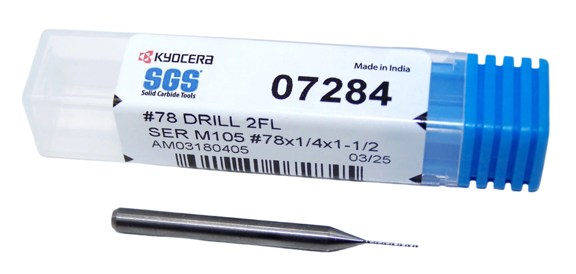 07284 Kyocera SGS #78 Carbide Drill 2 FLUTE 0.0160" Diameter .250" Flute 1.50" Length .125" Shank 130° Point