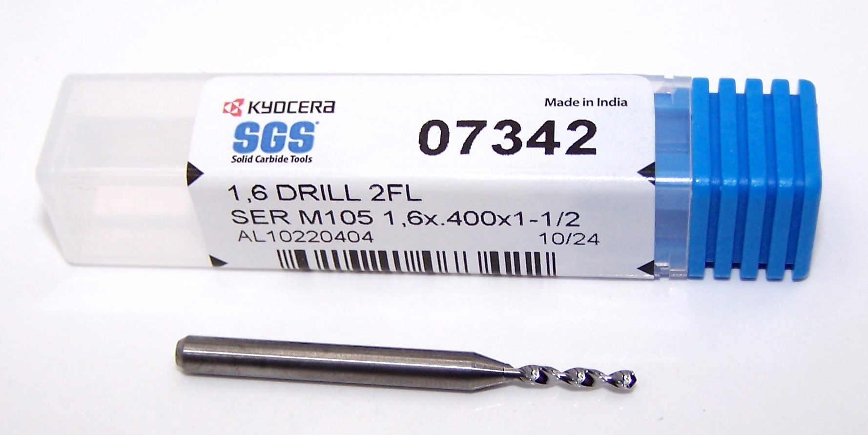 07342 Kyocera SGS 1.60mm Carbide Drill 2 FLUTE .0630" Diameter .400" Flute 1.50" Length .125" Shank 130° Point