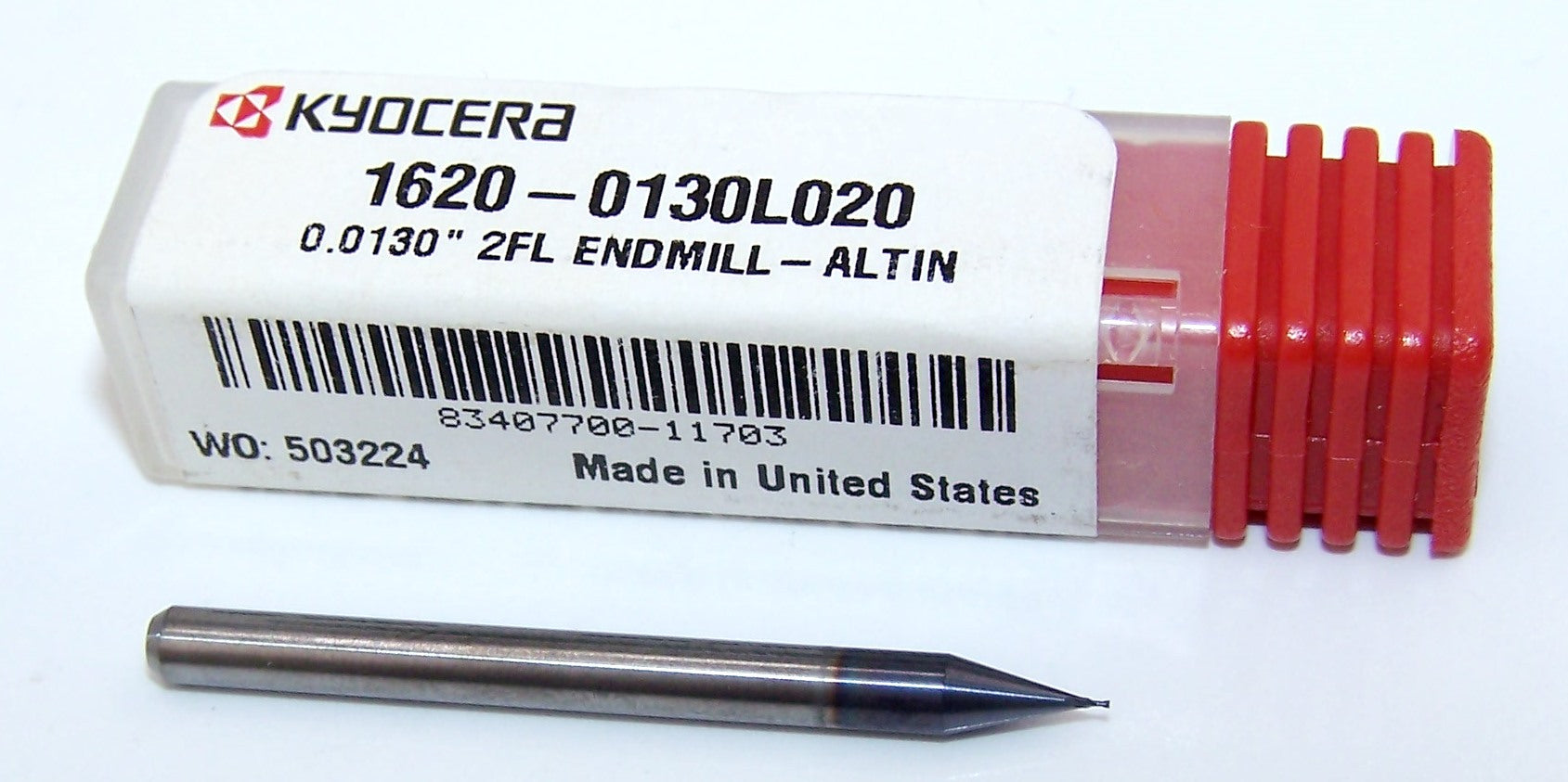 1620-0130L020 Kyocera 0.0130" Carbide 2 Flute End Mill ALTiN Coated 0.0130" Diameter 0.0200" Flute 1.5" Length 0.125" Shank