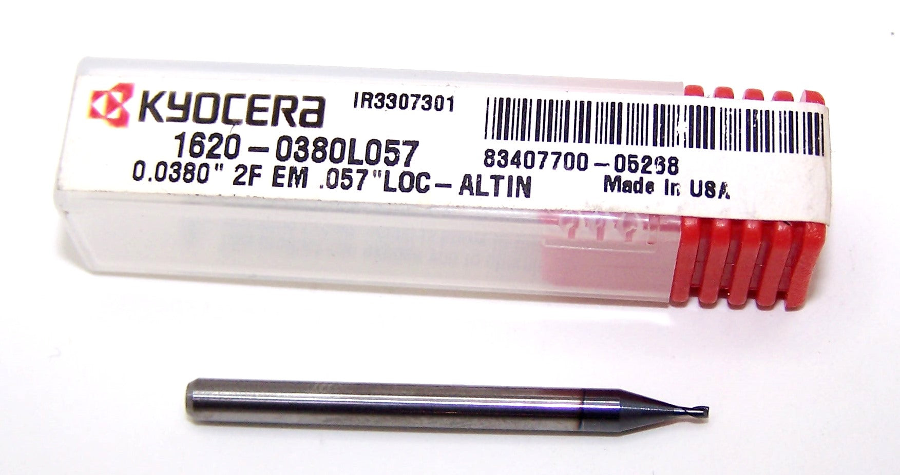 1620-0380L057 Kyocera 0.0380" Carbide 2 Flute End Mill ALTiN Coated 0.0380" Diameter 0.0570" Flute 1.5" Length 0.125" Shank