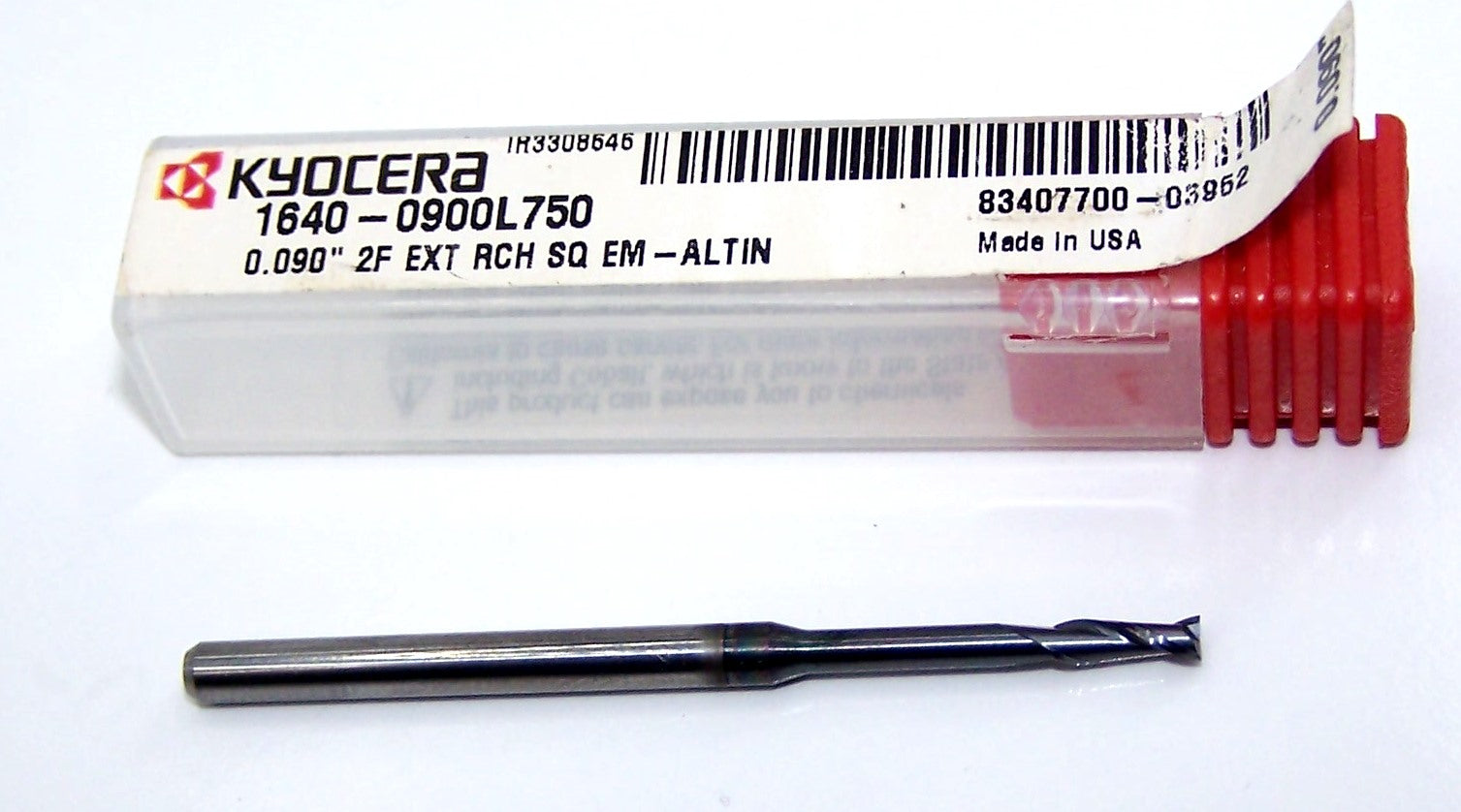 1640-0900L750 Kyocera .0900" Carbide 2 Flute End Mill Extended Reach SQ AlTiN Coated .0900" Diameter .270" Flute 2.00" Length .125" Shank .750" Reach