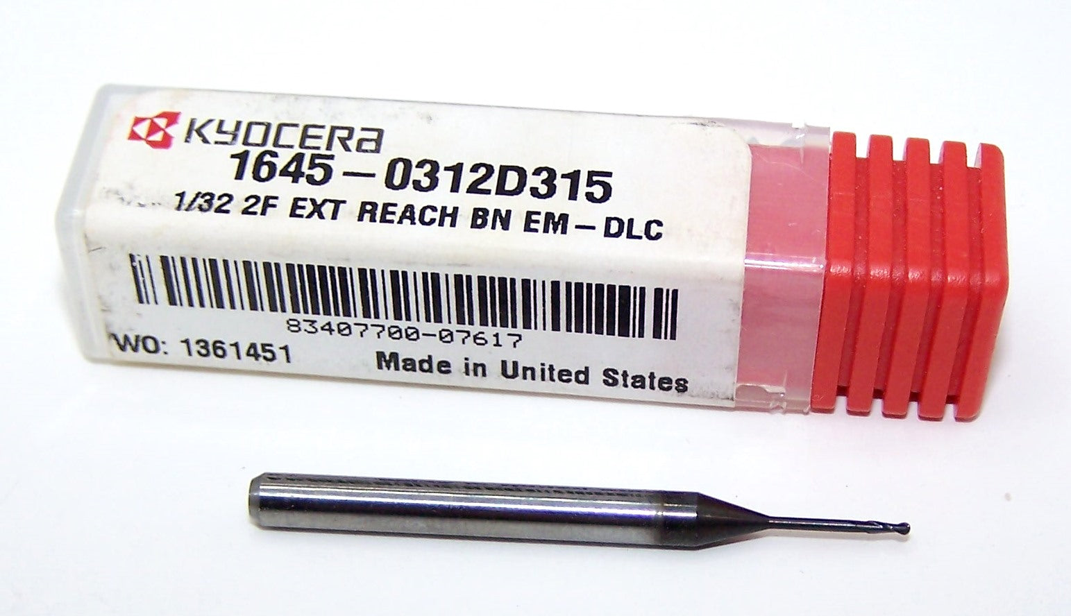 1645-0312D315 Kyocera 1/32" Carbide 2 Flute End Mill Extend Reach Ball End DLC Coated .0197" Diameter .093"Flute 1.50" Length .125" Shank .315" Reach