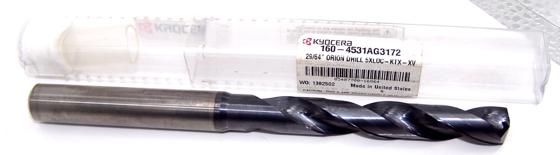 160-4531AG3172 Kyocera 29/64" Carbide 2 Flute Drill High Performance .4531" Diameter 3.172" Flute 6.00" Length .500" Shank 142° Point Coated External Coolant