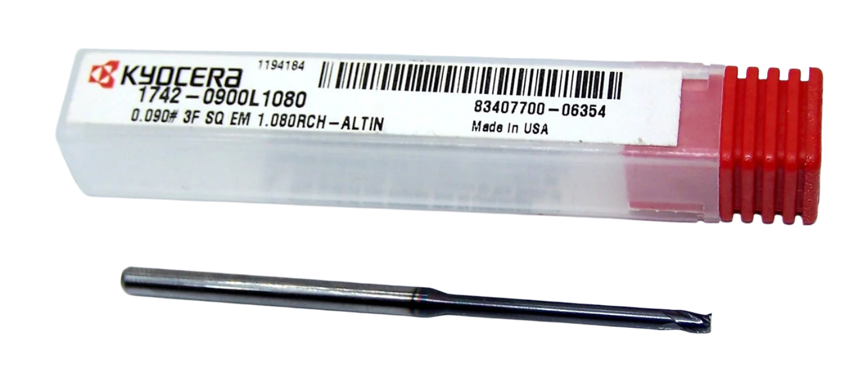 1742-0900L1080 Kyocera 0.0900" Carbide 3 Flute End Mill 1.080" Extended Reach ALTiN Coated 0.0900" Diameter .135" Flute 2.5" Length 0.125" Shank
