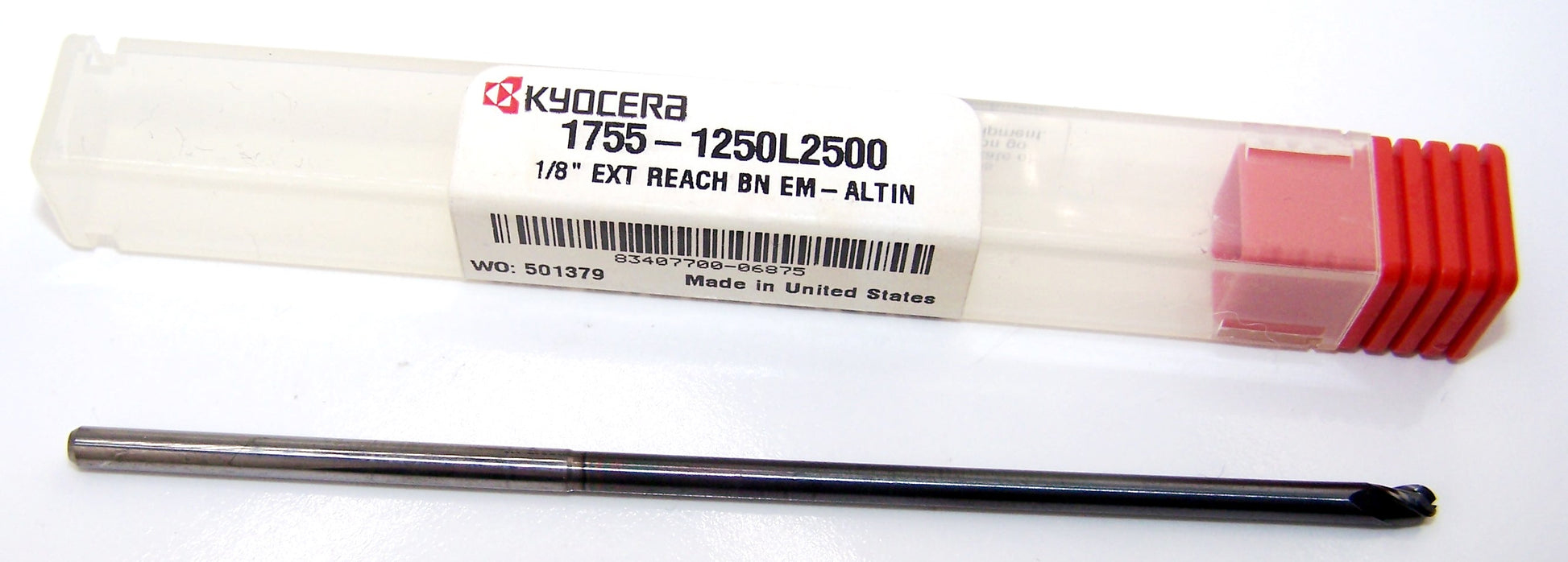 1755-1250L2500 Kyocera Microtools 1/8" Carbide 3 Flute End Mill Extended Length Ball End AlTiN .125" Diameter .187" Flute 4.00" Length .125" Shank